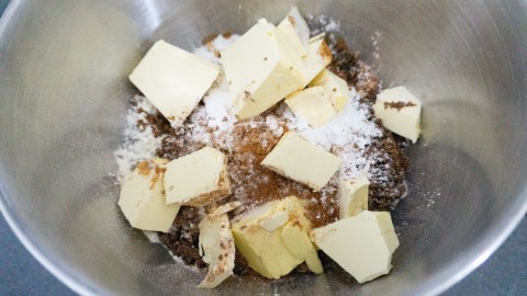 Doe de bloem, bruine basterdsuiker, speculaaskruiden, bakpoeder, de lactosevrije melk en het zout in een kom. Snij de koude boter in stukjes en voeg ook toe.