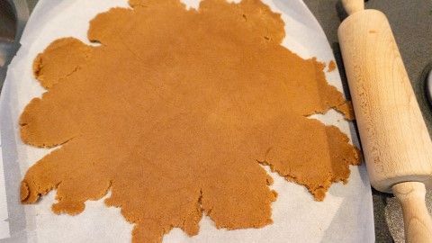 Rol nu het deeg tussen twee vellen huishoudfolie of bakpapier met behulp van een deegroller uit tot een lap van ongeveer 0.5 cm dikte. (Hou je hem wat dikker? Dan blijven de speculaasbrokken wel wat zachter van binnen.)
