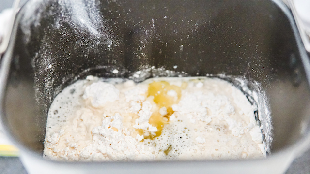 Voeg nu de olie toe en de 370 gram speltbloem toe.