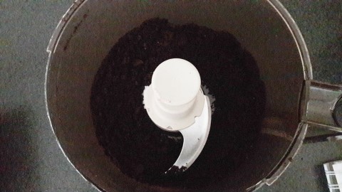 Haal de koekjes uit elkaar en haal de vulling eruit met een mesje en doe in een schaaltje. Maak de koekjes fijn in de keukenmachine. Of doe ze in een stevig plastic zakje en rol er met een deegroller overheen.