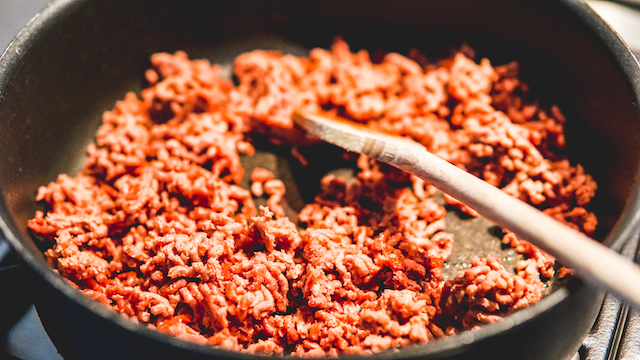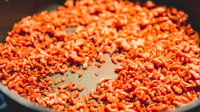 En bak het vegan gehakt een paar minuten totdat het verkleurd en rul gebakken is.
