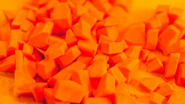 Schil de zoete aardappels en snij in blokjes. Ik had kleine blokjes gesneden maar je kunt ze ook wat groter houden.
