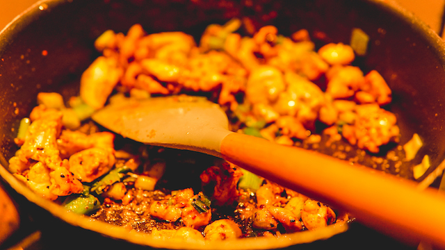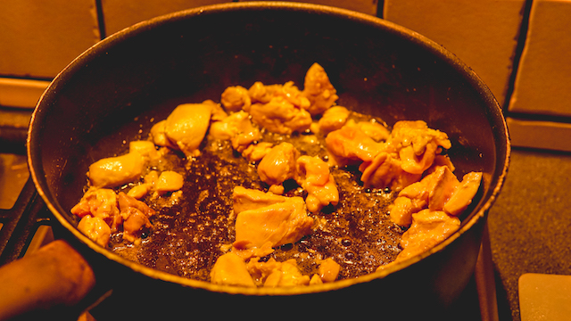Doe de olie in de hapjespan en bak de kippendijen gaar.