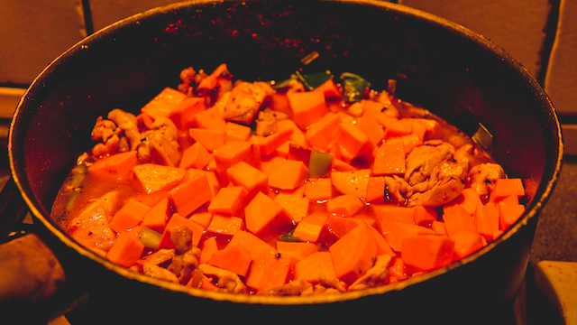 Dit recept voor Surinaamse röti met zoete aardappel en sugar snaps is voor 3 personen.