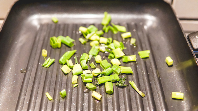 Doe een scheutje olie in de grillpan (of koekenpan) en voeg de lente-ui toe.