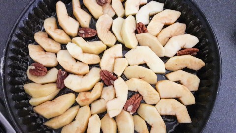 En verdeel nu de appel partjes en de pecannoten/walnoten over de bodem van de taartvorm.