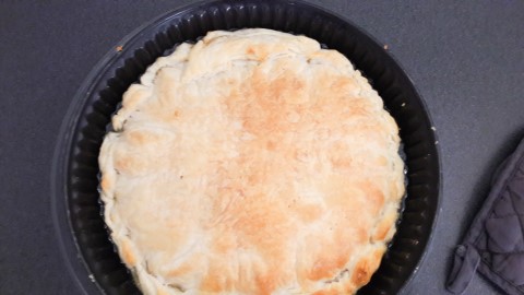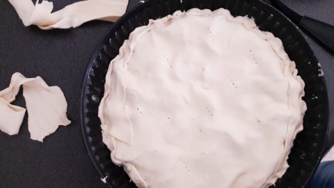 Leg de bladerdeeg op de appels in de vorm en druk het deeg bij de randen voorzichtig aan en wat eroverheen valt snij je eraf met een mesje. En dat kun je verdelen over de randen waar nog geen bladerdeeg zit. Prik wat gaatjes in de bladerdeeg met een vork.