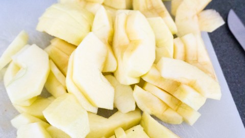 Schil de appels en snijd ze in 6 of 8 partjes. Je kunt ze ook iets dikker snijden dan zijn de appels straks beter zichtbaar, maar wij vinden het zo het lekkerst. Nu zijn ze lekker zacht. En besprenkel ze met citroensap.