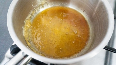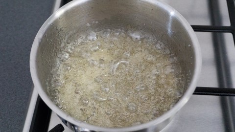 Maak de karamel in een steelpan met dikke bodem. Doe de suiker en het water in de steelpan en breng aan de kook.