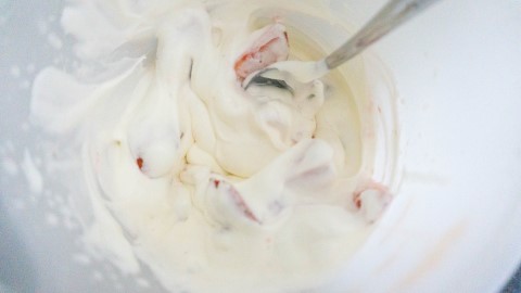 Snij de aardbeien in stukjes. Meng de slagroom met de aardbeien.