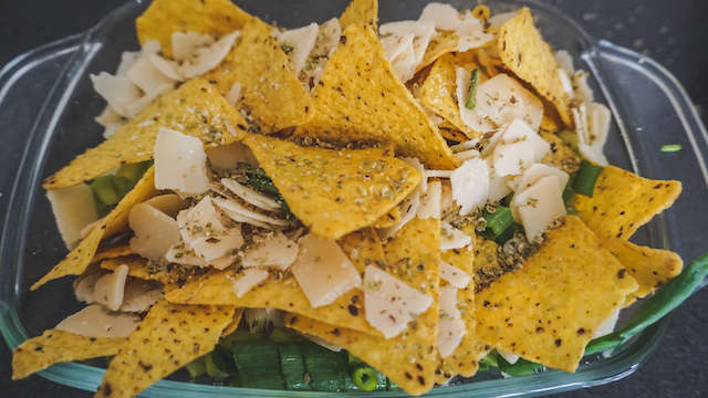 Snij de lente-ui en de paprika fijn. En verdeel deze door de chips.