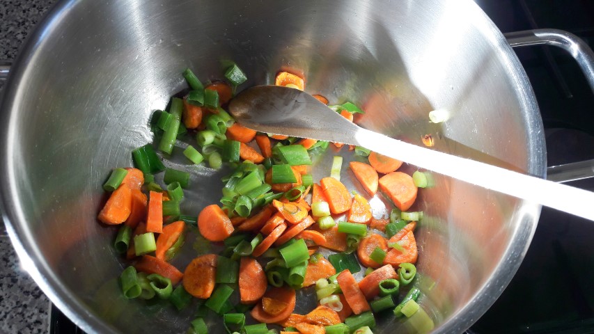 Doe een scheutje olie in de kookpan en voeg de fijngesneden groente toe.