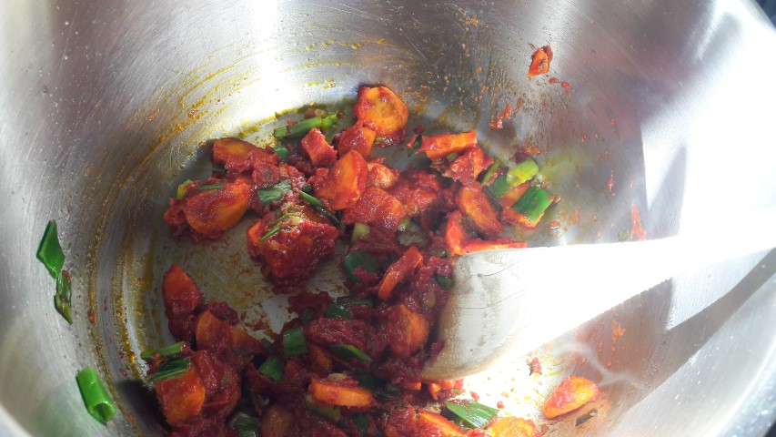 Fruit een paar minuten en voeg dan de knoflook en het blikje tomatenpuree toe. Roer even goed door voor een paar minuten.