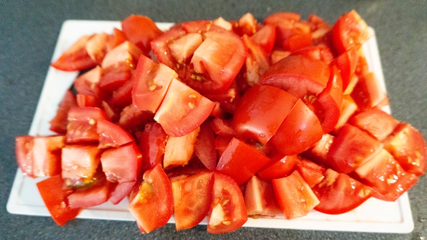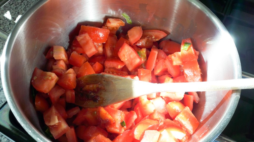 Voeg nu de tomatenblokjes toe en bak een paar minuten mee.