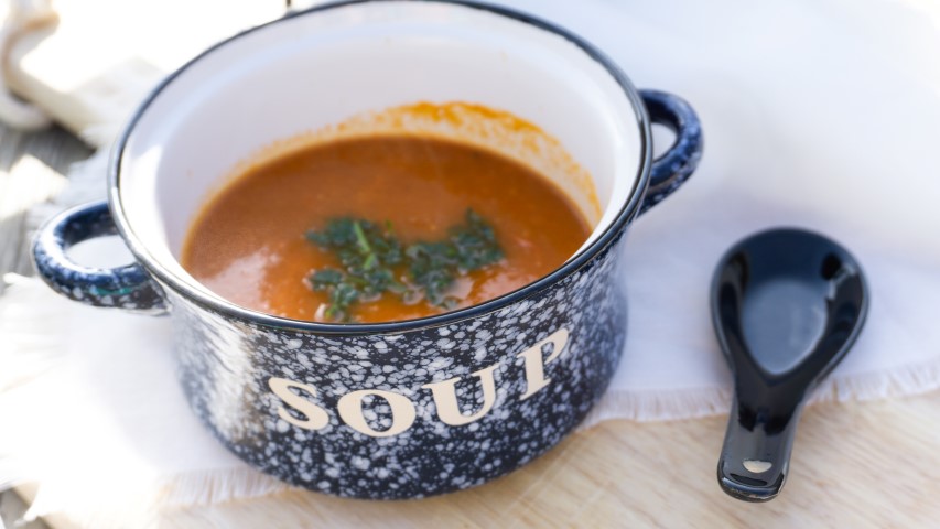 Pureer de verse tomatensoep nu met een staafmixer tot een mooi glad geheel.