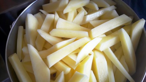 Schil je aardappels en snij in lange slierten zodat je mooie frietjes krijgt. Spoel ze een paar keer af met water en dep ze droog met een theedoek.