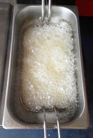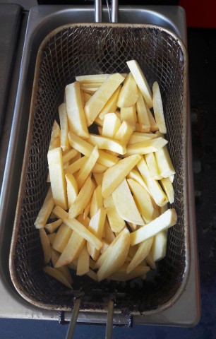 Verwarm je frietpan voor op 170 graden (iets kouder dan normaal). En bak de frietjes in ongeveer 5 minuten voor. Bedek een schaal of vergiet met wat keukenrol en doe de frietjes hierin. Je moet ze in ongeveer 2 a 3 porties bakken. Zet de frietpan weer uit en laat de frietjes minimaal een uur afkoelen.
