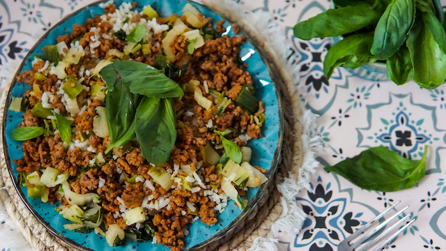 Dit recept voor zilvervliesrijst met kruidig gehakt is voor ongeveer 4 personen.